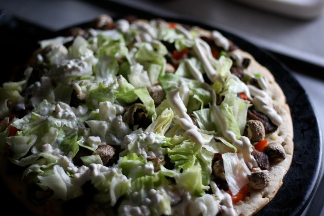 Prepare crust by brushing with olive oil. Cook steaks on the grill to your taste after rubbing with some salt and pepper. Let steak rest for 5 minutes before slicing against the grain into thin strips. Cover crust with mozzarella cheese. Top with your favorite toppings. I used tomatoes, onion, fresh mushrooms, red and green peppers. Top with slices of the steak. Bake at 400 for 15 minutes or until mozzarella cheese is melted. Remove from oven. Top with chopped lettuce and drizzle with blue cheese dressing. Slice and enjoy!