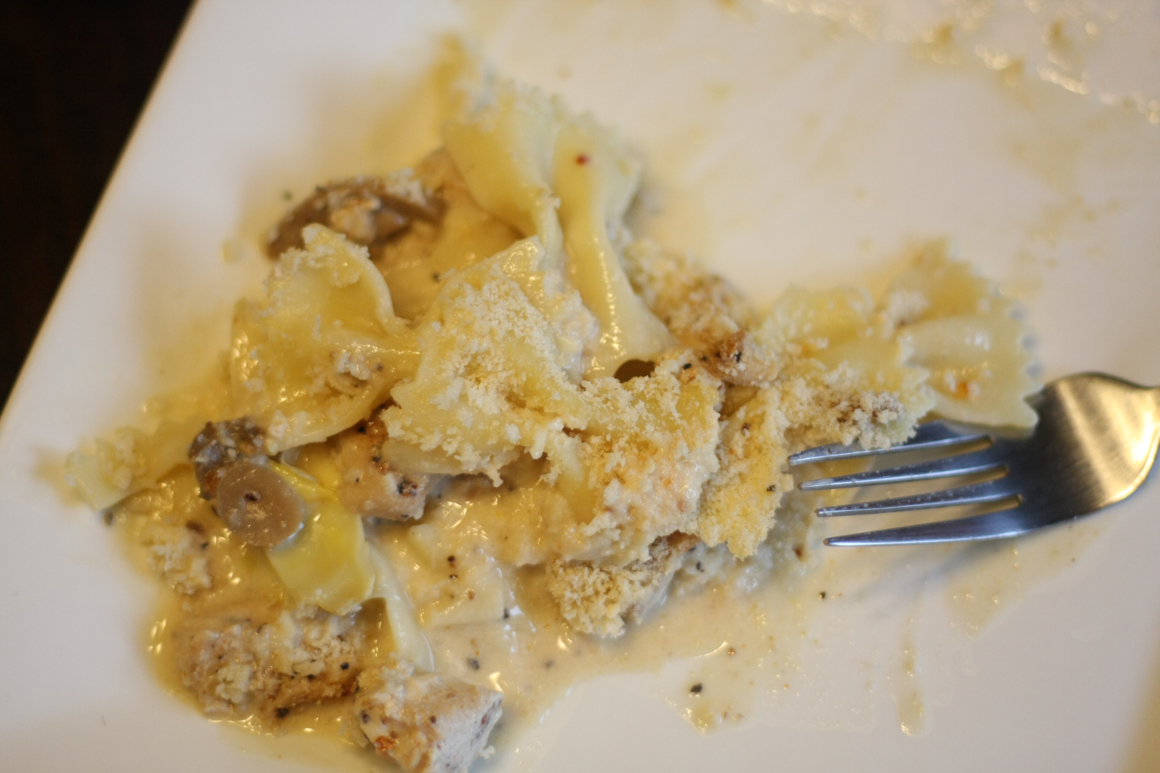 Heat olive oil in large skillet. Heat over medium high heat and pour chicken pieces in. Sprinkle with Montreal seasoning to taste. It has quite a kick. While chicken is cooking, bring large bowl of water to boil and cook pasta until al dente. Drain pasta. Cook chicken until cooked through. In a large mixing bowl, mix chicken stock, Alfredo sauce, mushrooms and artichoke pieces. Stir well. Take drained pasta and add to sauce mix. Pour into a large casserole dish. Take cooked chicken pieces and pour over pasta mix. Take a spoon and press into the pasta. Mix cheese and panko bread crumbs and sprinkle on top. Cover with foil and bake at 350 degrees for 20 minutes. Remove foil and bake for an additional 15 minutes. Enjoy!