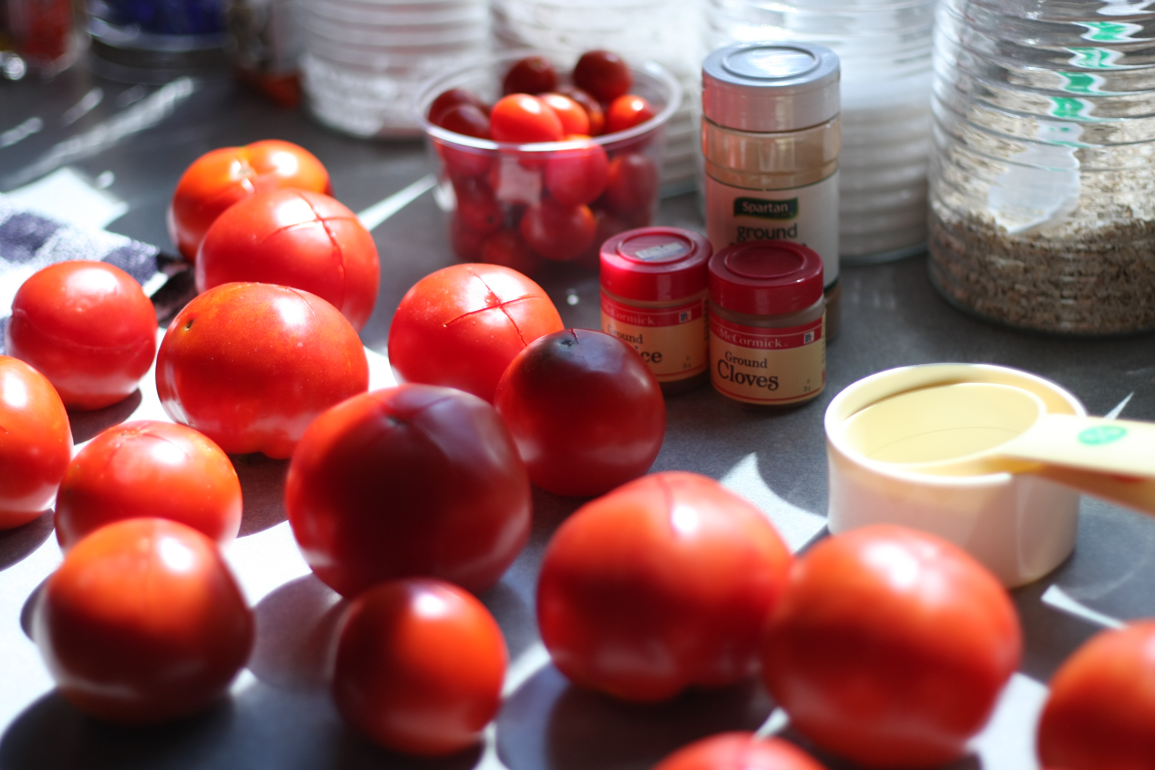 About a year ago, we were out in Wisconsin visiting my Grandma, who is now over 80 years old. Her and her boyfriend still have a huge garden that they harvest and almost everything that comes out of it, they can. At dinner one night, my Grandma pulled out a jar of tomato jam. I thought in my head, “Gross, who eats this stuff. It sounds disgusting.” My Grandma told me to take a piece of toast and just try it. Four pieces of toast later, I was hooked. This has turned into my favorite jam ever and I decided to plant tomato plants this year just so i could make a bunch of it. Well, my tomato plants were terrible, I ended up getting about 4 tomatoes from them. But my sister, who has a very green thumb and a huge garden, had plenty to share. So today was tomato jam day. I’m not kidding, you must try this jam. I promise, you will definitely be wanting more!