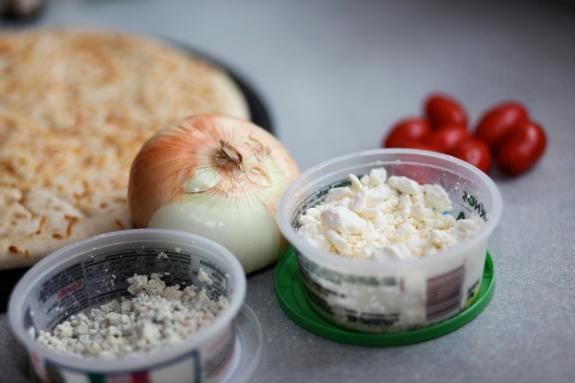 meanwhile, cover crust with feta and tomatoes